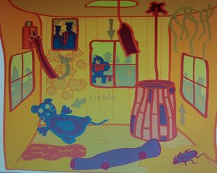 Infront of the seat was a screen showing a hand drawn and animated scene. Just below the monitor was a hole in the wall obscured by a black cloth so the user couldn't see through. The guest would have to reach into the hole with their arm to feel the cartoon world in 3d. Certain items would be interactive, such as a toy rat. When you tough the rat in real life it would giggle on the screen.
